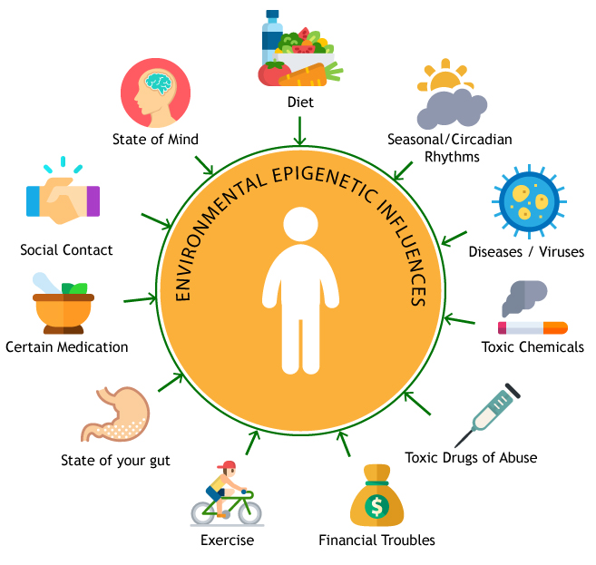 Assim, o epigenoma pode ser afetado por experiências positivas, como relacionamentos de apoio, oportunidades de aprendizagem e outros estados de entusiasmo, ou influências negativas, como toxinas ambientais, circunstâncias que causem stress e outros estados de desânimo. Esses estados deixam uma "assinatura" epigenética nos genes, temporária ou permanente, afetando a facilidade com que os genes são ativados ou desativados. Pesquisas demonstram que pode haver maneiras de reverter certas mudanças que afetam a saúde e restaurar o funcionamento saudável do corpo e mente.